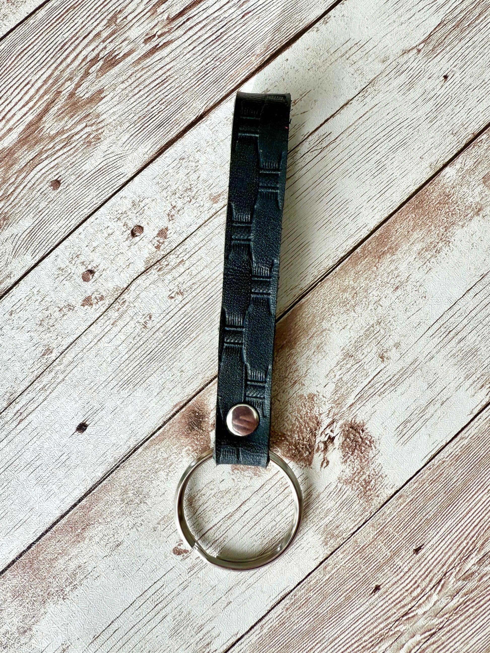 Leather Keychain - Hand-Stamped Navy with Stainless Steel